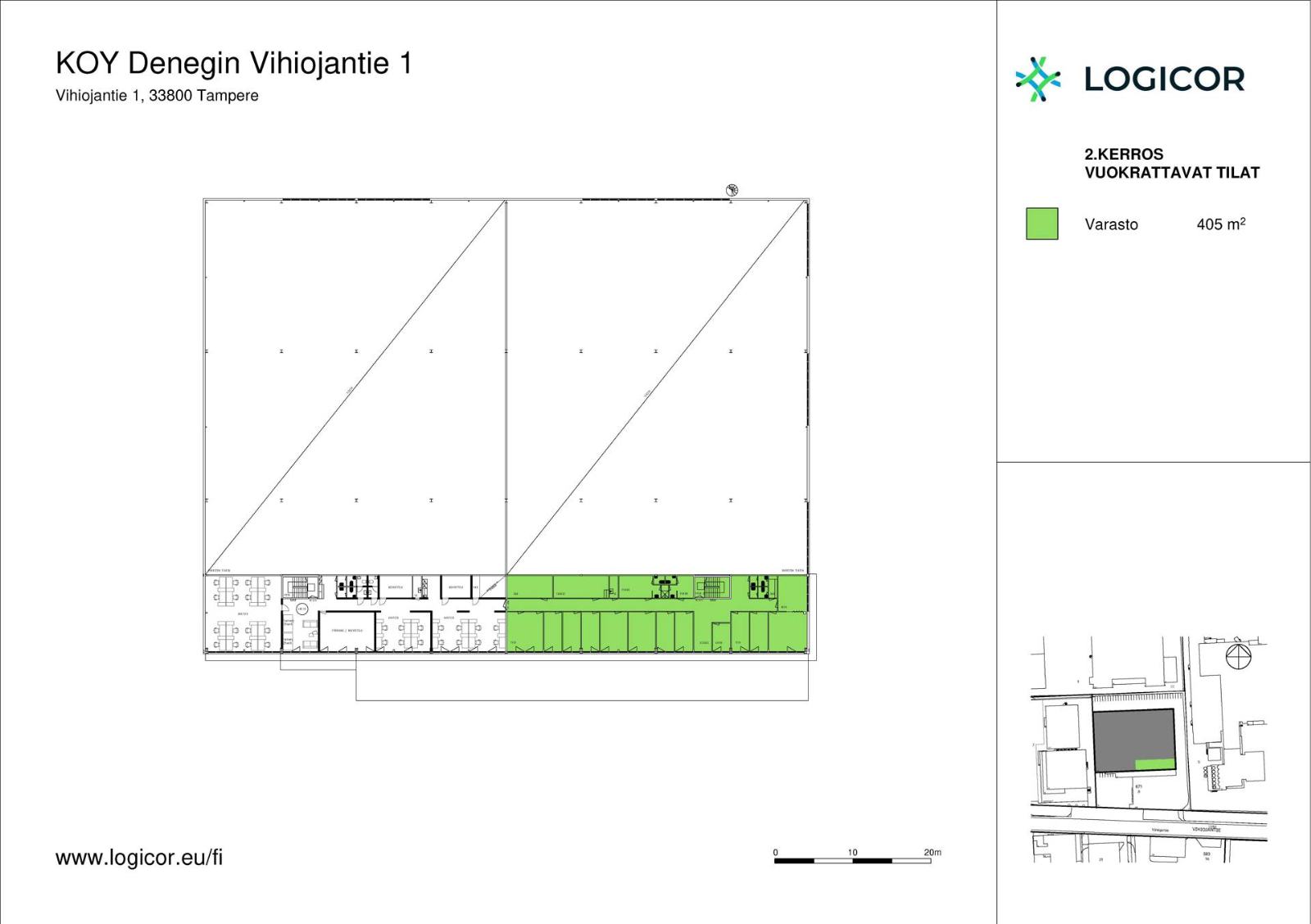 Vuokrattavana 2 581 m² varastotilaa, jonka yhteydessä on toimistotilat (351 m²) ja omapiha-alue. Tilan vapaa korkeus on 10 metriä ja tilassa on kaksi omaa maantason nosto-ovea. Tilat soveltuu hyvin myös tuotanto- ja tukkuvarastokäyttöön.