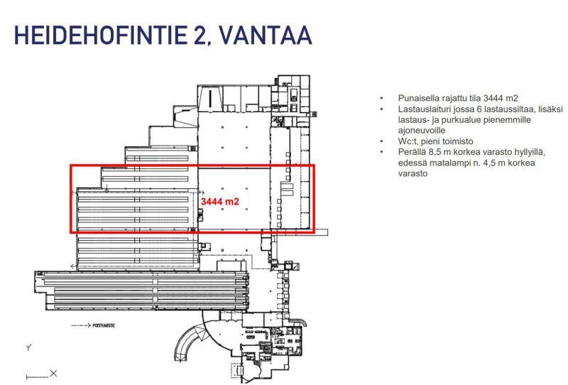 Vuokrattavana 3 421 m² katutason varastotilat Vantaan Kuninkaalassa. Varastohallin vapaa korkeus parhaimmillaan 8.5 metriä, lastauslaituri jossa 6 kpl lastaussiltoja, pieni toimisto, sosiaalitilat, varastohallissa on varastohyllyjä.