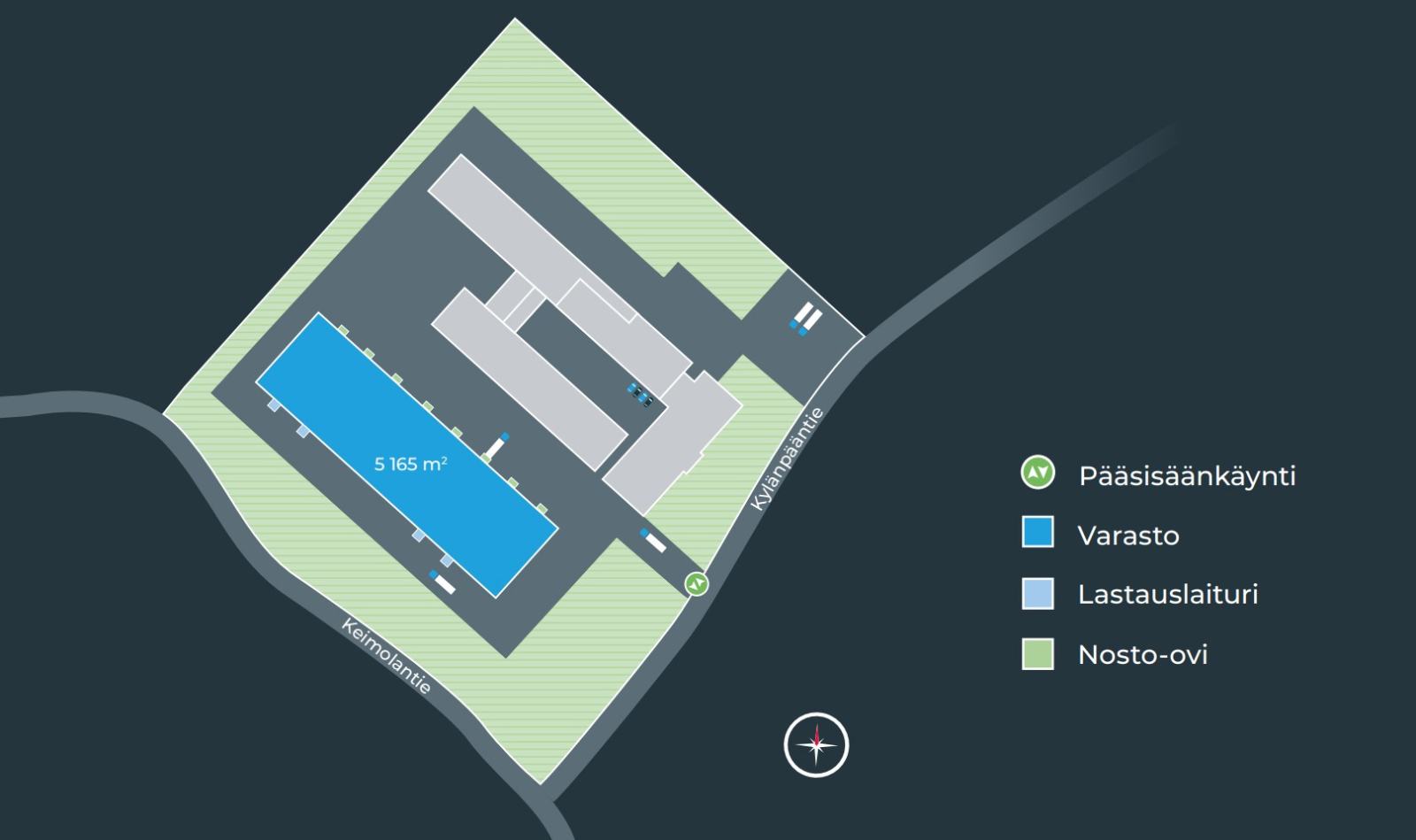 Vuokrattavana Kivistössä 5 165 m² korkeaa varastotilaa varustettuna neljällä lastaustaskulla ja usealla nosto-ovella. Tila voidaan jakaa esim. kahdelle käyttäjälle, myös sisäänajo ja läpivirtausliikenne on mahdollista. Varaston korkeus on 6 metriä.