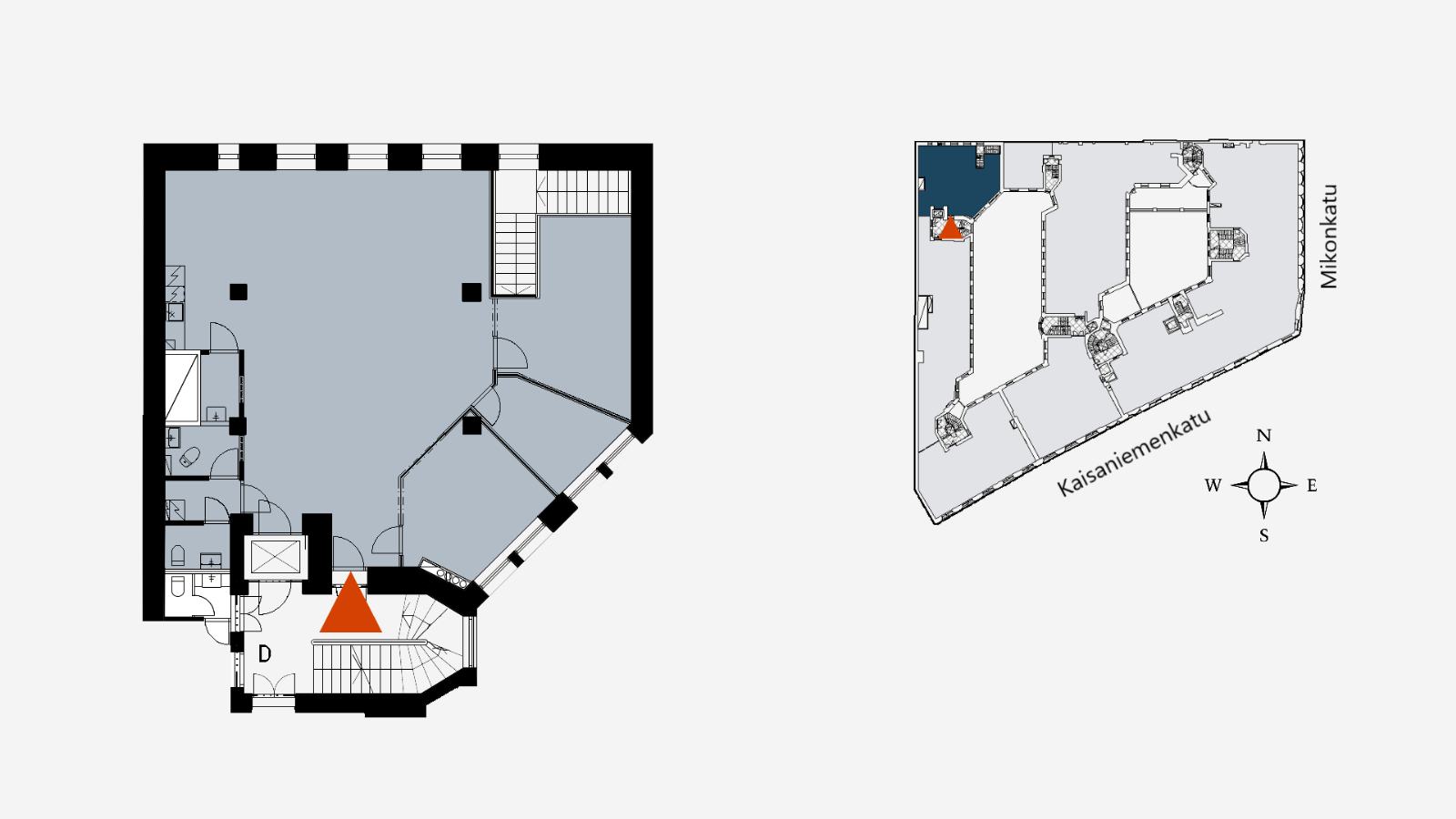 Tila koostuu avotilasta ja muutamasta erillisestä työhuoneesta. Helppo saavutettavuus joko Mikonkadulta tai Kaisaniemenkadulta. Ikkunat rauhalliselle sisäpihalle.