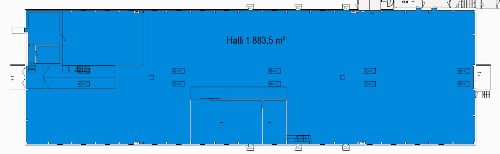 Kokonainen hallivarastotila, jossa yksi lastaustasku ja maantason nosto- ovi toisessa päädyssä. Halli on pilariton ja vapaakorkeus on n. 6m. Halli on remontoitavissa uuden käyttäjän tarpeisiin. Sisältää sosiaalitiloja ja toimistohuoneita.