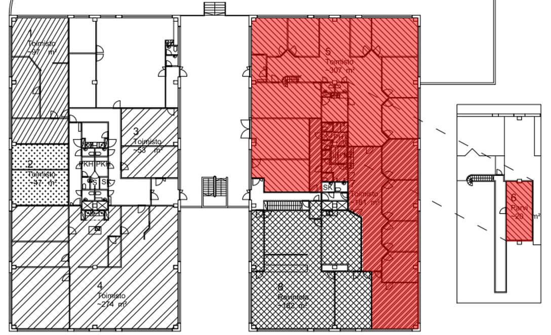 Toimistotila on pääosin avotilaa, mutta myös muutama toimistohuone on valmiina. Tilassa oma wc ja keittiö. (pohjakuva ei pidä enää huonejaon puolesta paikkaansa). Kohteessa toimii lounasravintola.