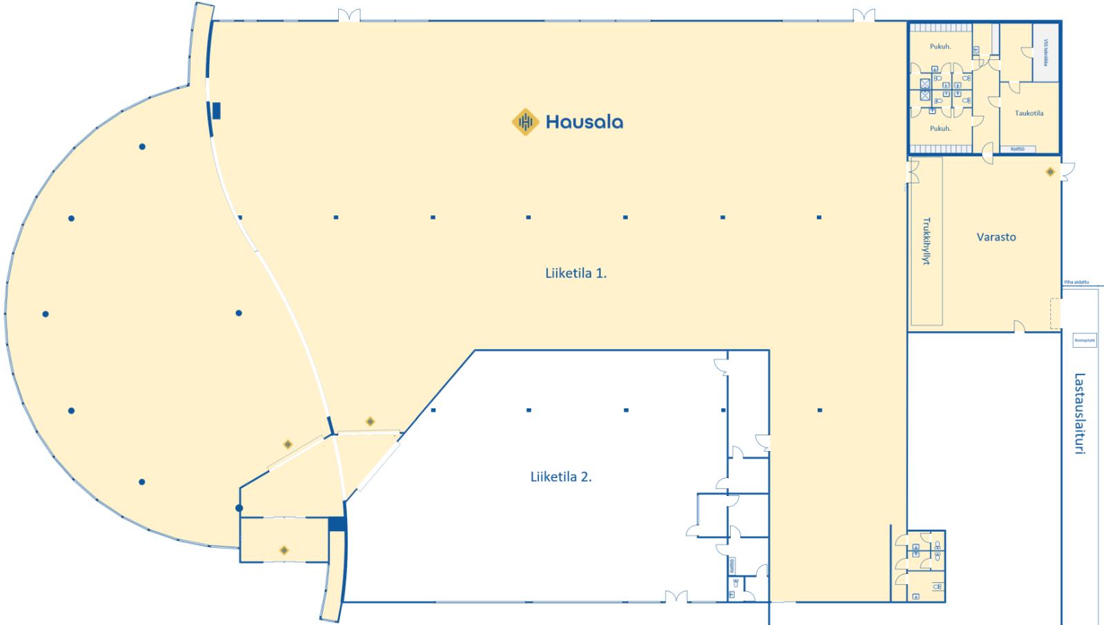 Tila koostuu lasikaaren näyttelytilasta sekä avarasta avotilasta. Asiakas wc:t löytyvät tilan perältä. Sosiaalitilat ja taukotila on rakennettu väestönsuoja tiloihin. Varastossa on trukkihyllyt valmiina yhdellä seinällä ja väestönsuoja tilan katto on otettu luovasti käyttöön lisävarasto tilaksi. Tilasta nosto-ovi lastauslaiturille missä iso nostopöytä valmiina auttamassa lastien purkamista ja pakkaamista.