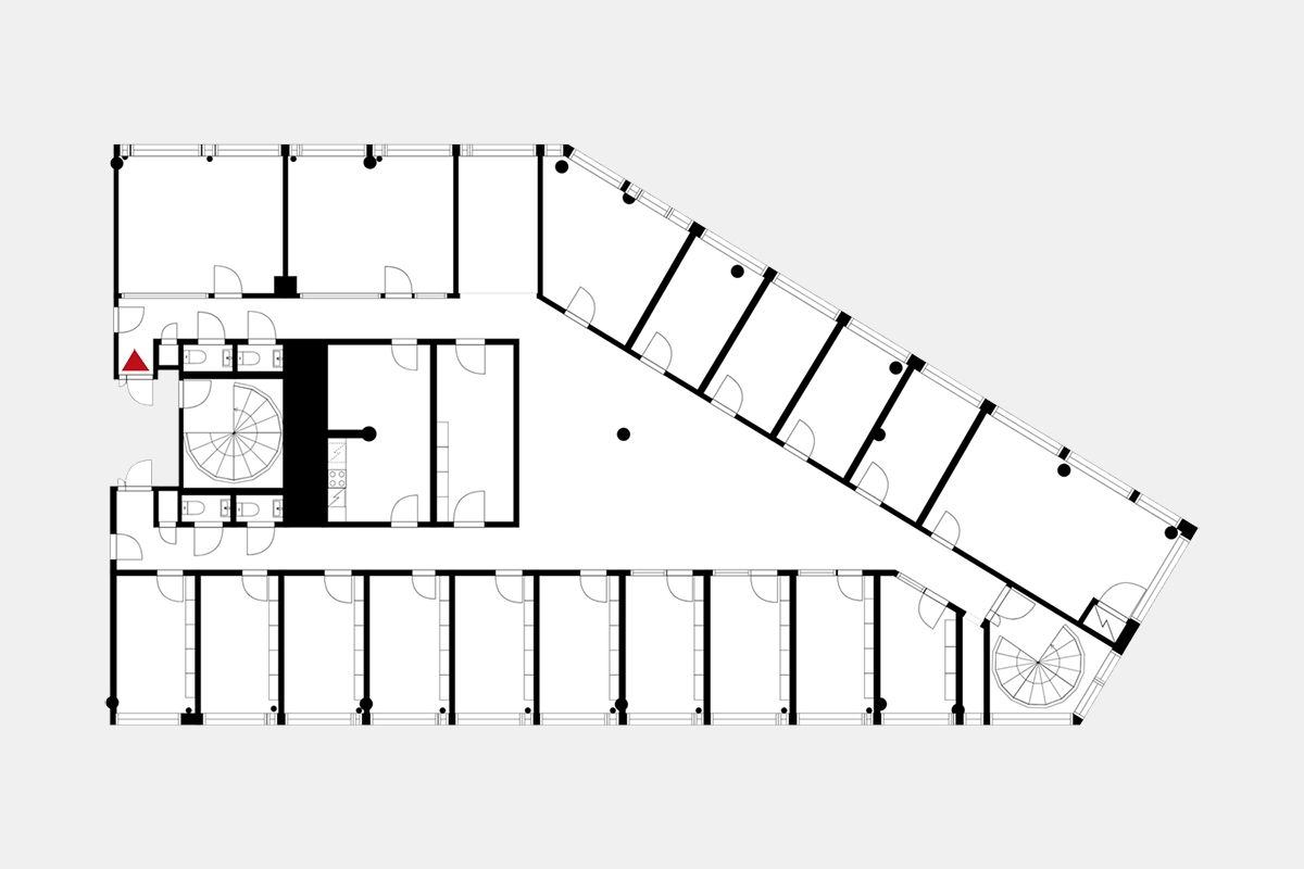 Ylimmän kerroksen tila sisältää erikokoisia työ- ja ryhmätyöskentelyhuoneita. Keittiö löytyy erillisestä taukotilasta toimistotarvike tilan vierestä.