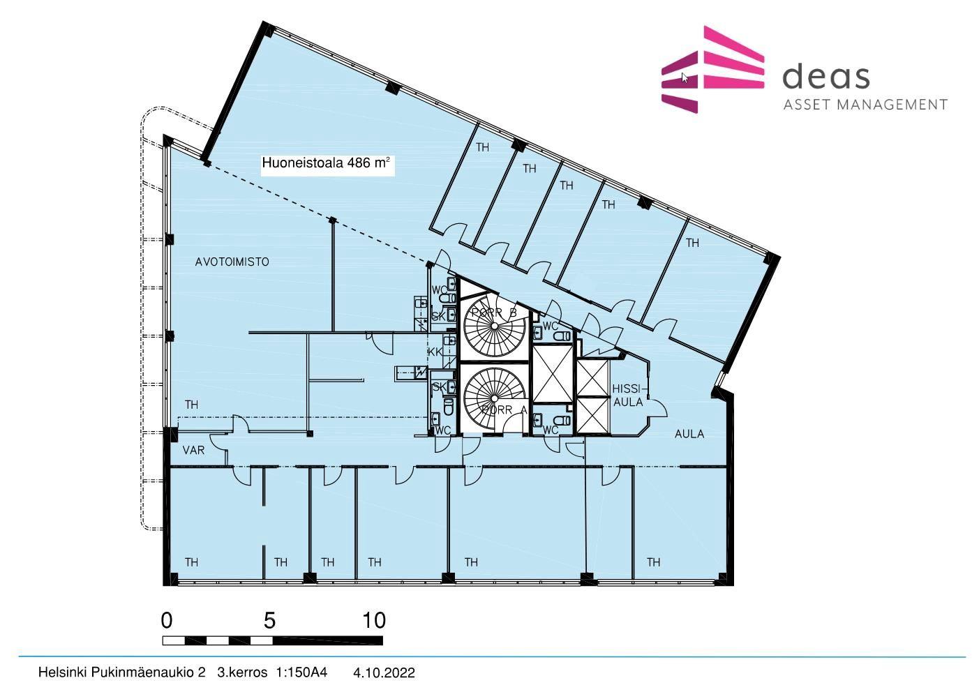 Vuokralle tarjotaan koko kerroksen kattava 486 m² jäähdytetty toimistotila. Tila on mahdollista jakaa 238 - 248 m².