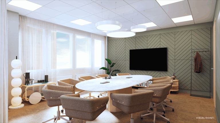Toimisto luonnos koostuu avokonttoritilasta, työ-/neuvotteluhuoneista, erillisestä keittiöllisestä taukotilasta sekä omista wc tiloista. Tilaa voidaan muokata tarpeiden mukaisesti. Tila on jäähdytetty ja kiinteistössä valokuituyhteydet.