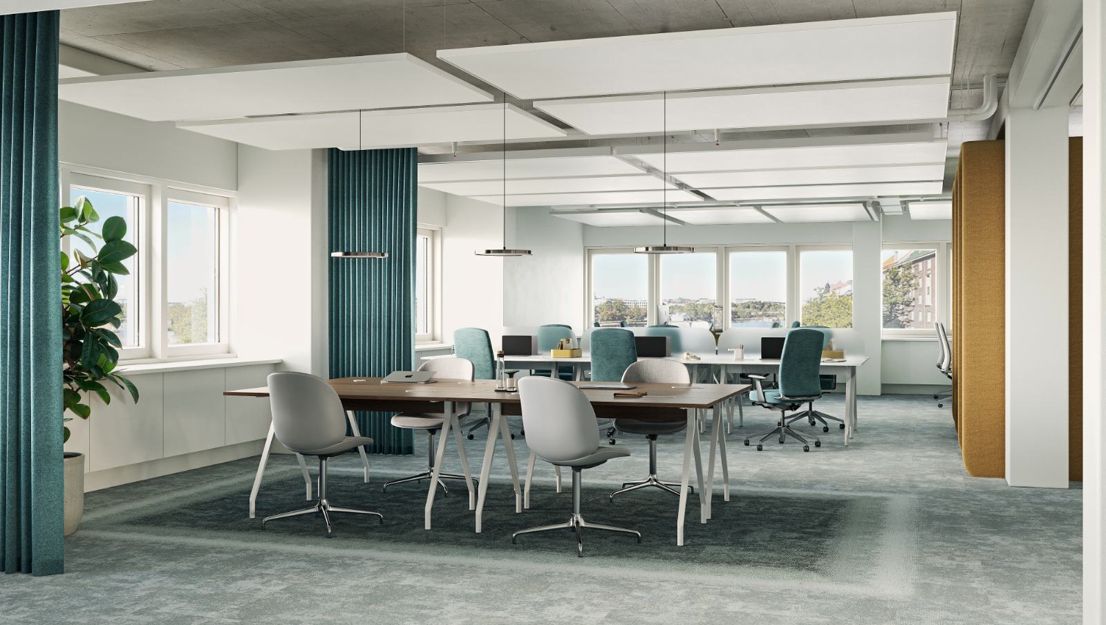 Remontoitua valoisaa avotoimistotilaa. Ilmanvaihto on jäähdytetty. Tilakuvat ovat visualisointi tarkoituksella esillä.