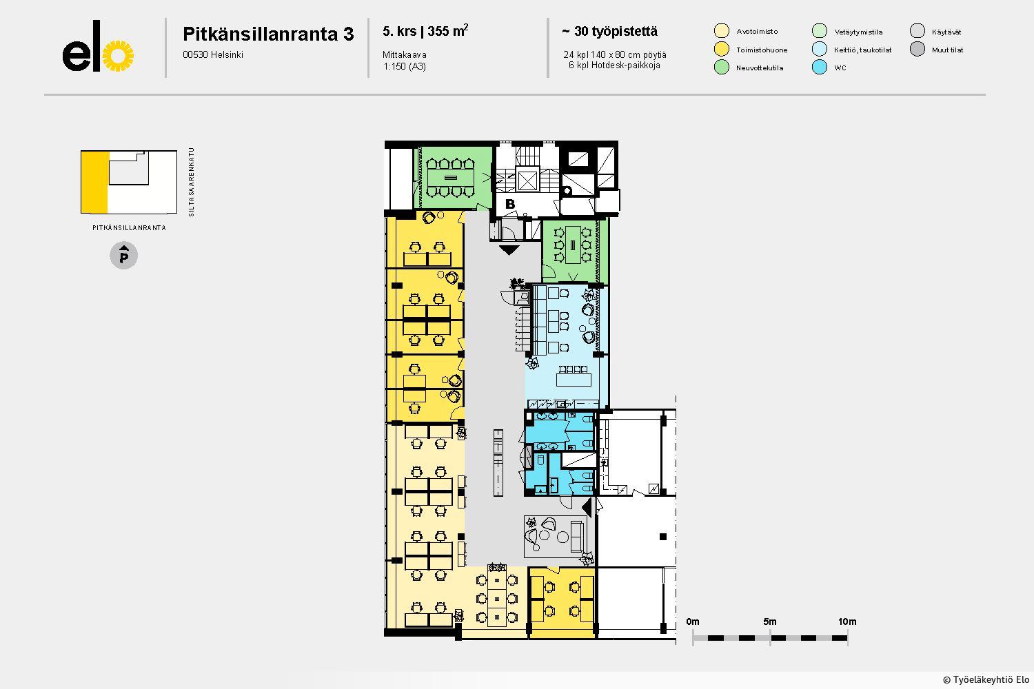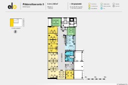 Tilassa on avotoimistoa, työ- sekä neuvottelutiloja. Erillisessä ruokailutilassa keittiö. Ilmanvaihto on jäähdytetty.