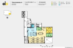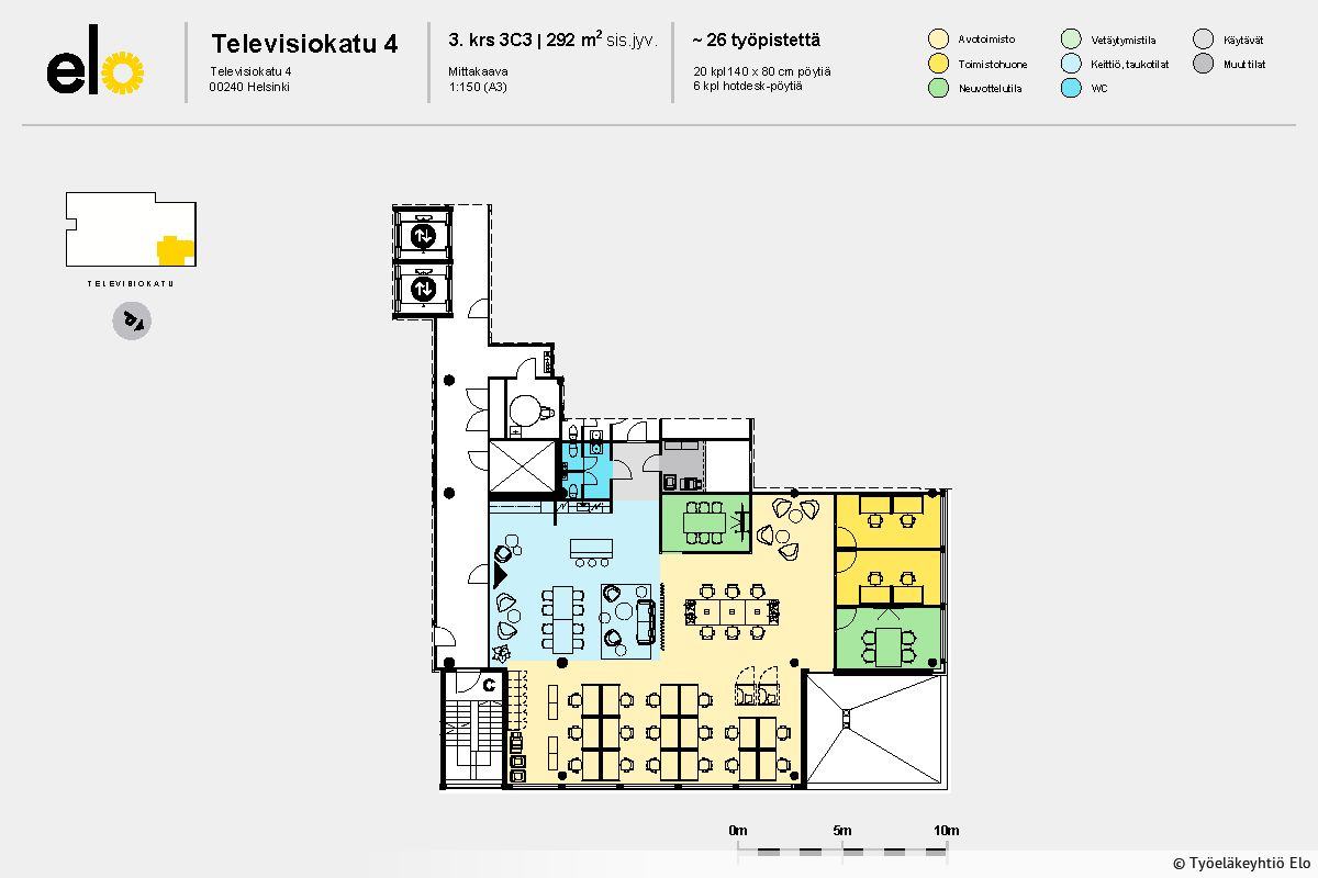 Toimisto koostuu avotyötilasta sekä useammasta ryhmätyötilasta. Lisäksi oma taukoalue keittiöllä sekä wc tilat.