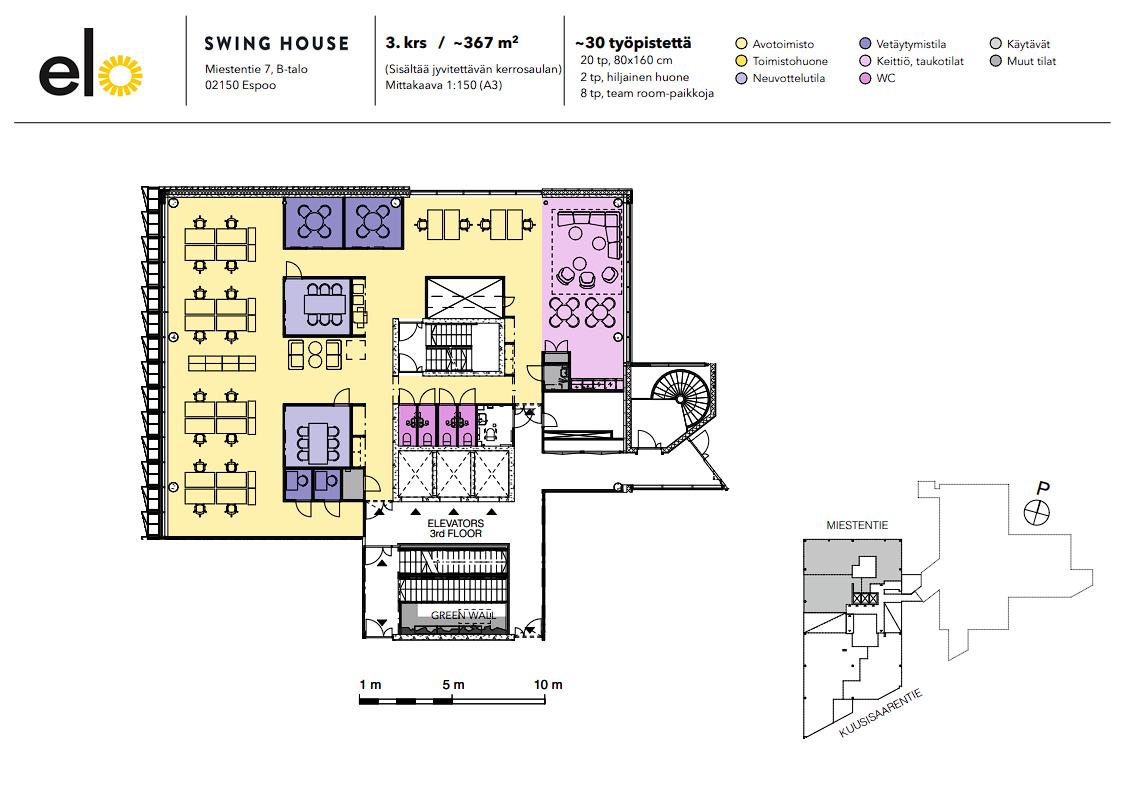 Toimisto koostuu avokonttoritilasta, työ-/neuvotteluhuoneista, erillisestä keittiöllisestä taukotilasta sekä omista wc tiloista.