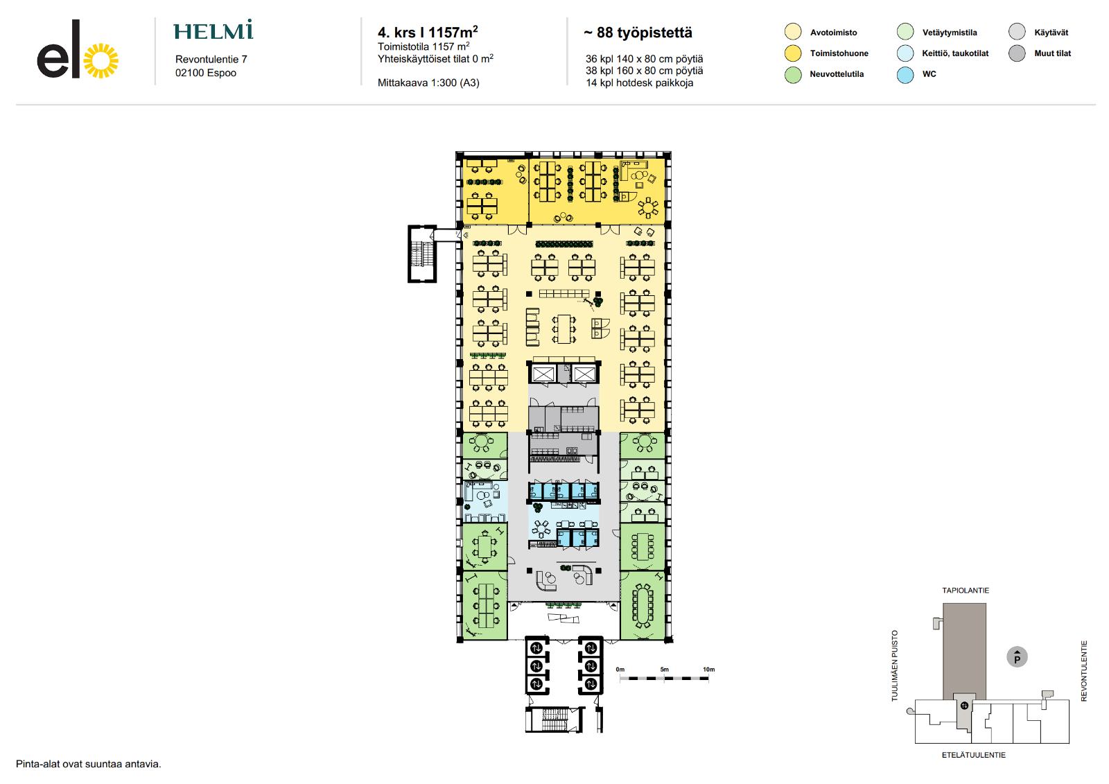 Toimisto koostuu eteisaulasta, avokonttoritilasta, useista työ-/neuvotteluhuoneista, erillisestä keittiöllisestä taukotilasta sekä vetäytymistiloista.