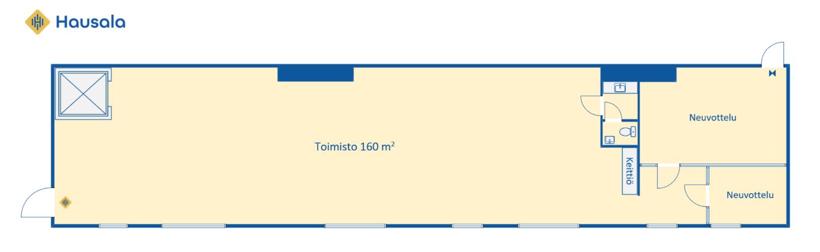 Toimisto koostuu avokonttoritilasta, kahdesta työ-/neuvotteluhuoneesta ja minikeittiöstä. Valoisuutta tilaan lisää kattoikkunat. Tila on muuttoon valmis!
