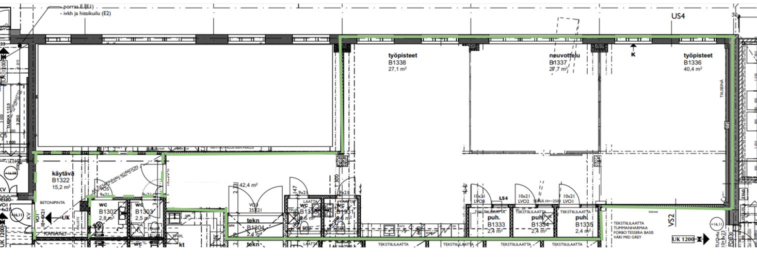 Toimisto koostuu avokonttoritilasta, neuvottelutilasta, useista puhelintiloista, keittiöllisestä taukotilasta sekä omista wc tiloista.