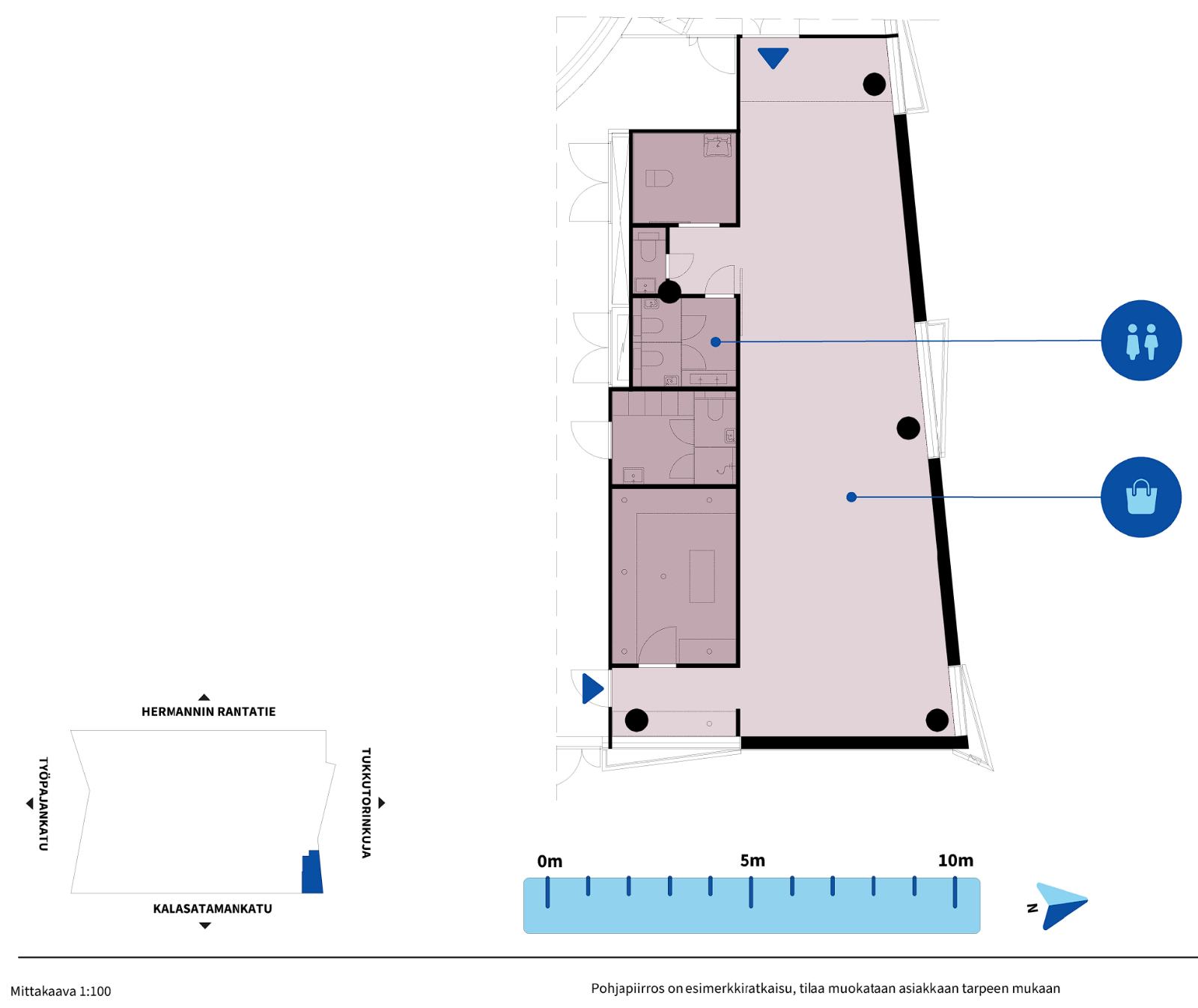 Vuokrataan Helsingin Kalasatamasta ensimmäisen kerroksen kulmasta 118 m² liiketila.