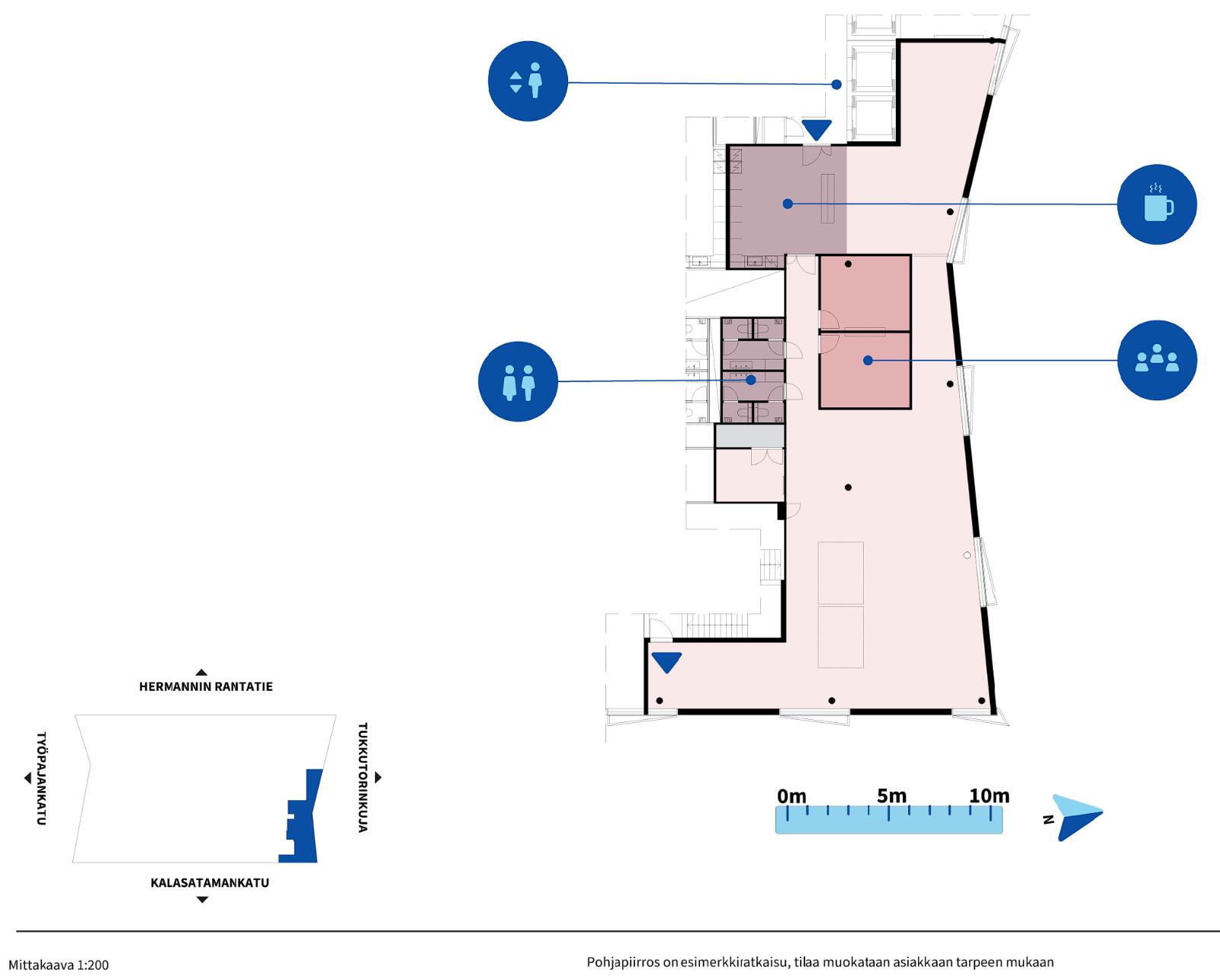 Toimisto koostuu avotilasta, työ-/neuvotteluhuoneista sekä erillisestä keittiöllisestä taukotilasta. Tilaa voidaan muokata tarpeiden mukaisesti.