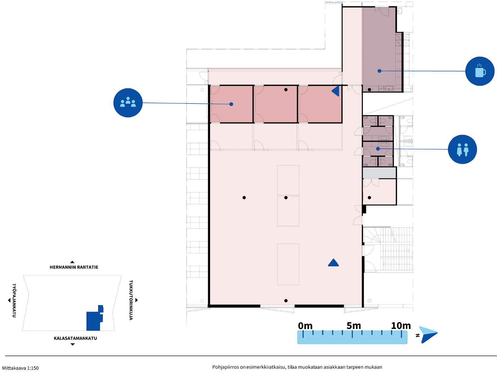 Toimisto koostuu avotilasta, työ-/neuvotteluhuoneista sekä erillisestä keittiöllisestä taukotilasta. Tilaa voidaan muokata tarpeiden mukaisesti.