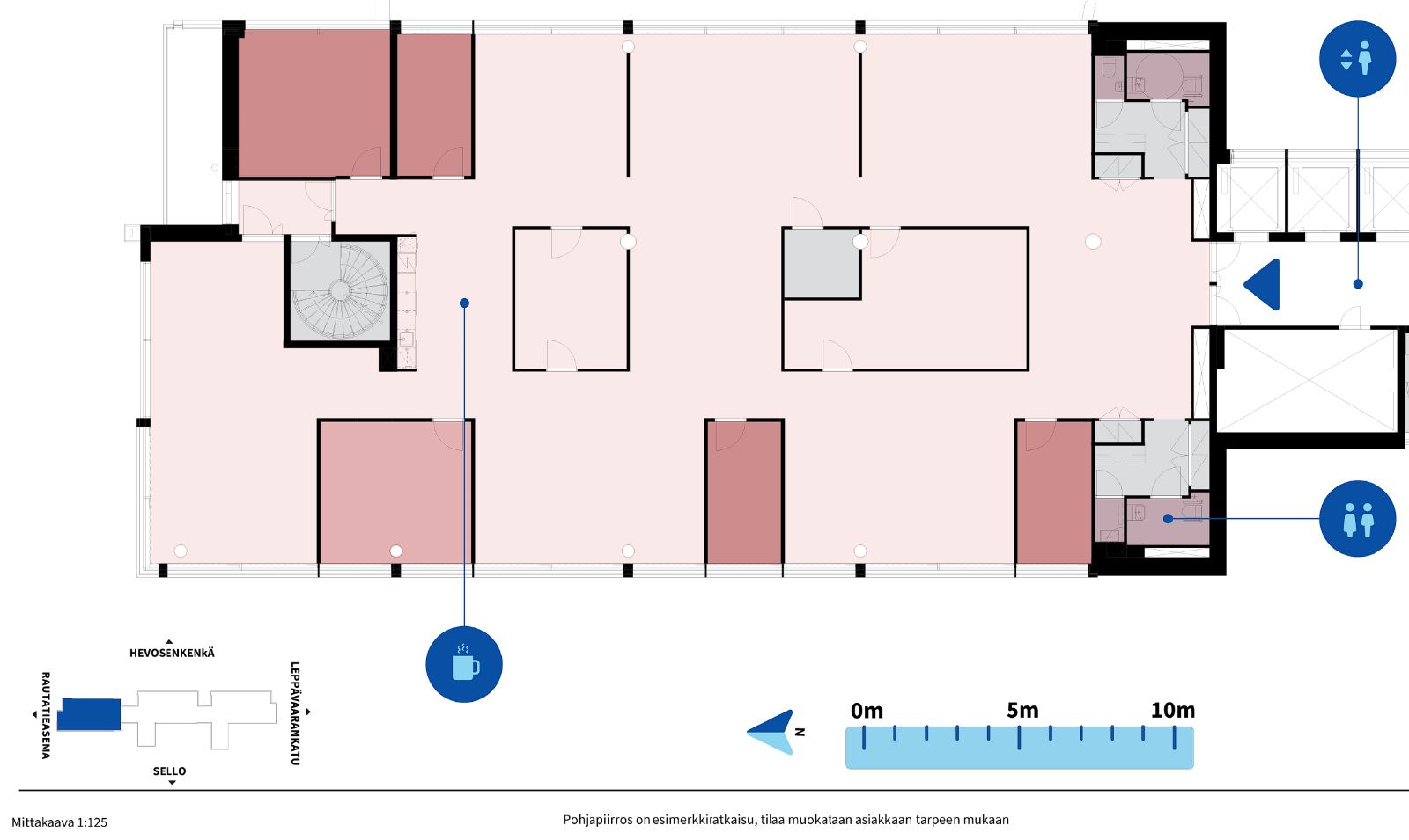 Toimisto koostuu avotilasta, työ-/neuvotteluhuoneista sekä erillisestä keittiöllisestä taukotilasta. Tilaa voidaan muokata tarpeiden mukaisesti.