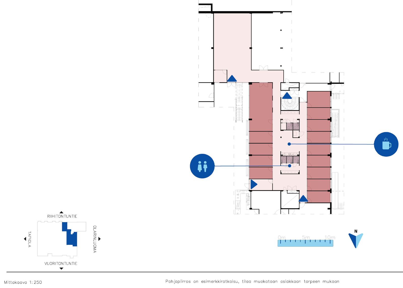 Toimisto koostuu avotilasta, työ-/neuvotteluhuoneista sekä erillisestä taukotilasta. Tilaa voidaan muokata tarpeiden mukaisesti.