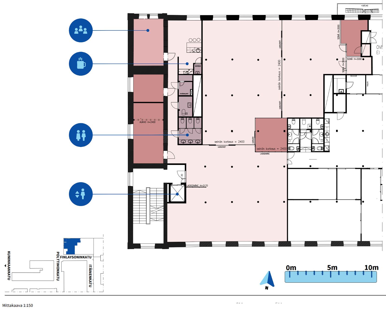 Toimisto koostuu avotilasta, työ-/neuvotteluhuoneista sekä erillisestä keittiöllisestä taukotilasta. Tilaa voidaan muokata tarpeiden mukaisesti.