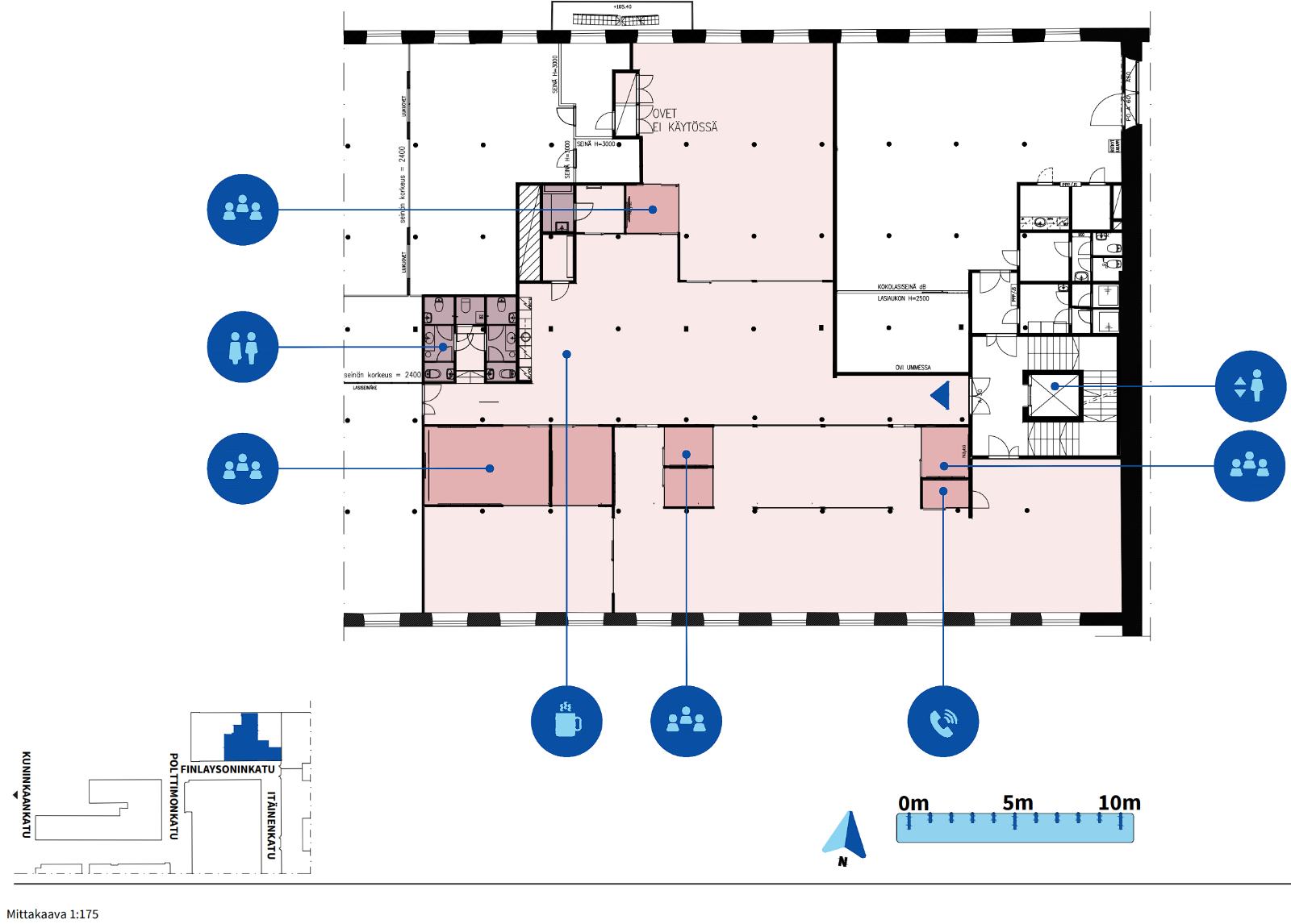 Toimisto koostuu avotilasta, työ-/neuvotteluhuoneista sekä erillisestä keittiöllisestä taukotilasta. Tilaa voidaan muokata tarpeiden mukaisesti.