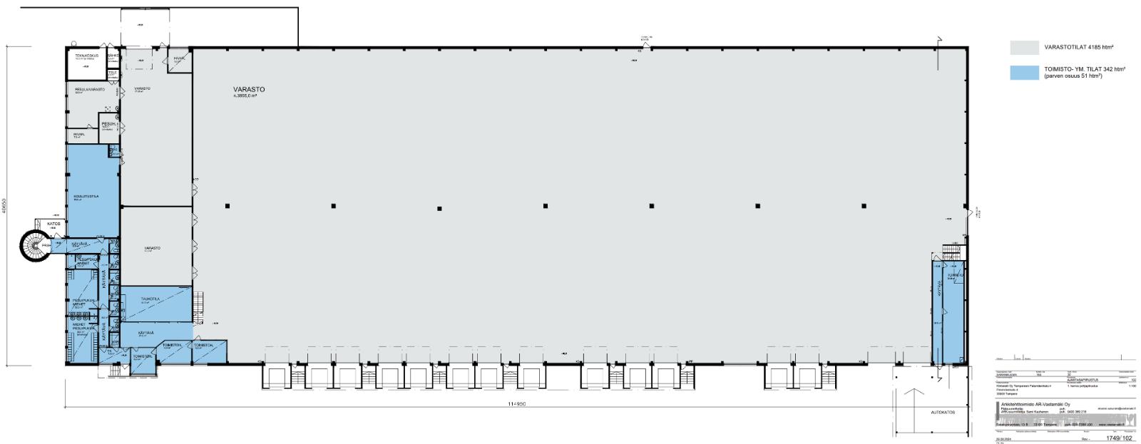 Tila jakautuu n. 4 200 m² varastoon ja 712 m² toimisto- ja aputiloihin.