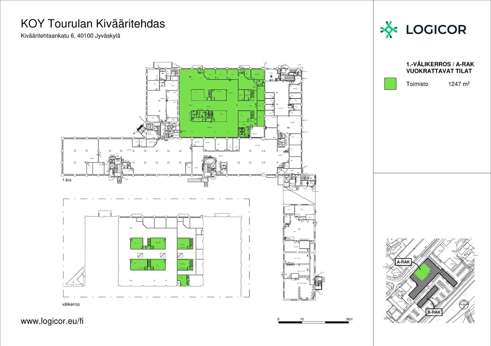 Vuokrataan Jyväskylän Tourulasta katutasossa 1 247 m² jäähdytettyä toimisto-/liiketila. Parvitilojen osuus kokonaisuudesta on noin 224 m²