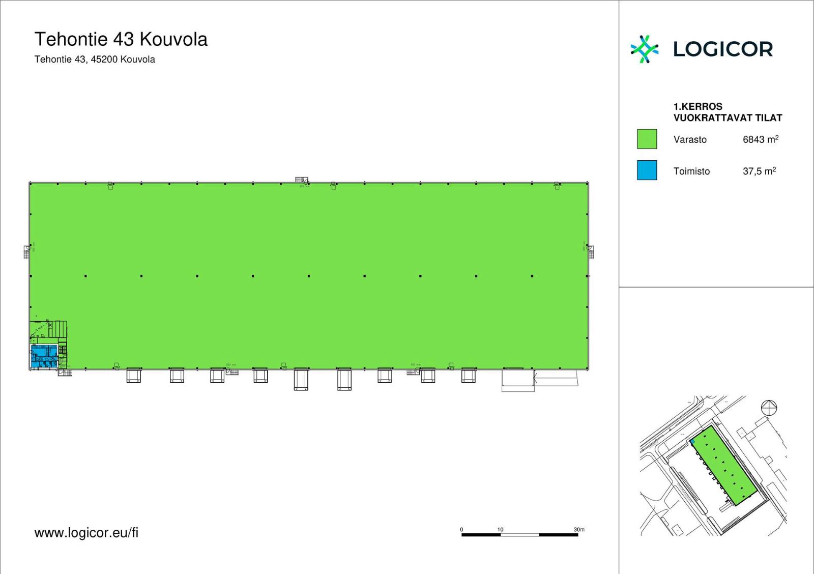 Vuokrattavana moderni 6 926 m² varastotila Kouvolan Kullasvaaran logistiikka-alueelta. Tilan vapaa korkeus on 7 metriä ja lattiakantavuus on 3 500 kg/m². Tilassa on 9 lastaustaskua, lastauslaituri sisäänajorampilla, pieni toimisto, sosiaalitilat ja taukotila.