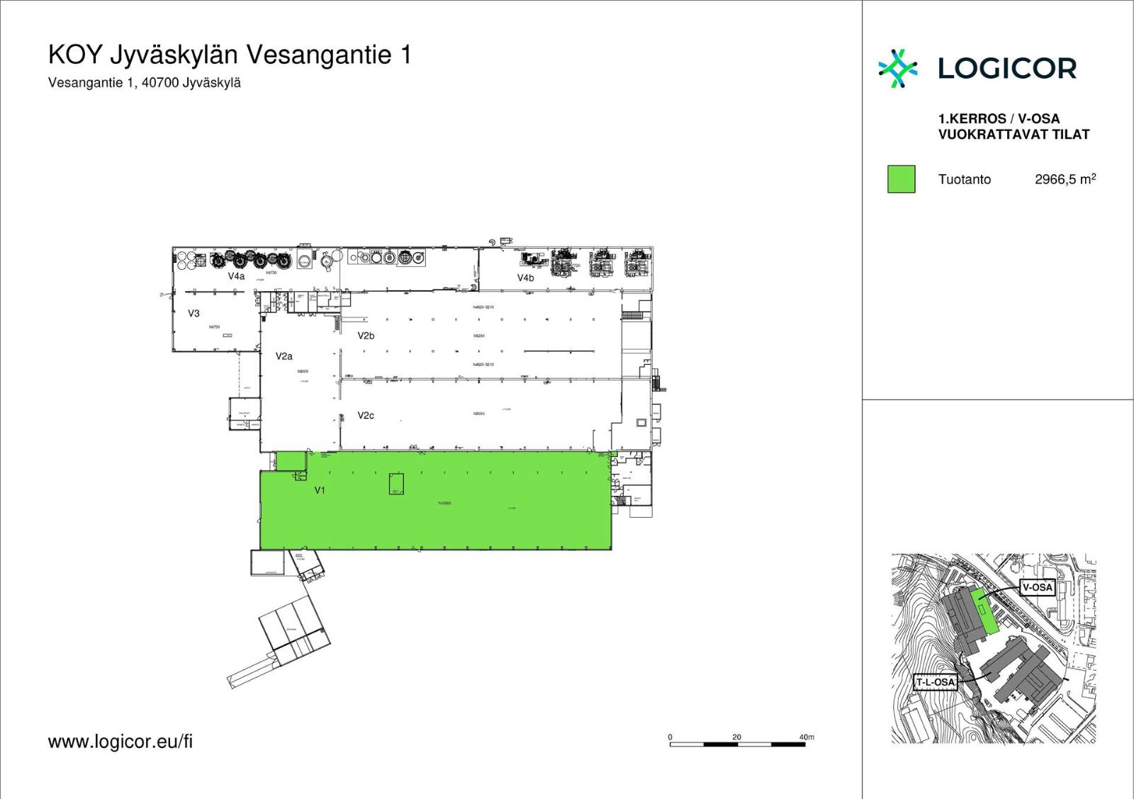Vuokrataan Jyväskylän Rautpohjasta 2 966 m² tuotantotila. Pohjakuvassa tunnus V1, jonka välittömässä läheisyydessä sisäyhteydellä on vuokrattavissa myös toimisto- ja sosiaalitilat henkilökunnan tarpeisiin. Tähän tilaan on maantason nosto-ovet, mahdollisuus lisänosto-oviin tilan sivuseinälle, ja tilassa on merkittävästi nostinkapasiteettia. Tilassa on toimivat siltanosturit. Tilan maksimikorkeus on noin 10 metriä.