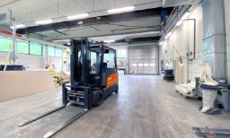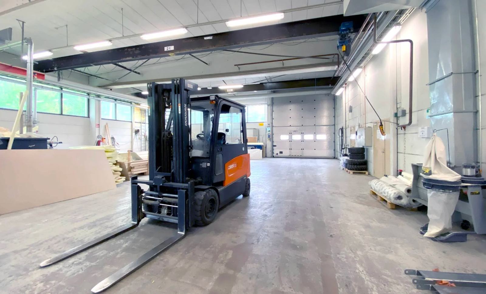 E-halli 1 579 m²: 2 kpl nosto-ovia L 4,0 m x K 4,45 ja L 3,0 m x K 3,0, vapaa korkeus n. 4,5 m, tilassa siltanostureita 2 kpl 4 tn + 4 tn ja 1,6 tn + 1,6 tn.