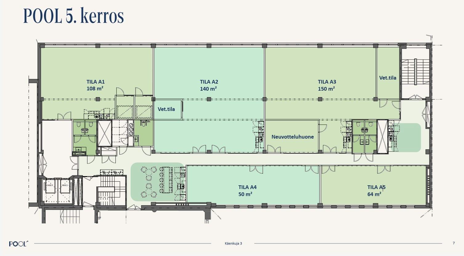 Vuokrataan kolmannen kerroksen 150 m² kalustamaton pientoimistotila toimistohotellista. Toimistohotelliin sisältyvät WLAN-yhteys, sähkö, kahvi, tee, nimetyn neuvottelutilan ja keittiötilojen käyttö, sekä yhteiskäyttöisten tilojen siivous.