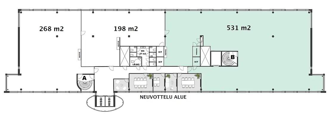 Tilat ovat valoisia ja tehokkaasti suunniteltuja, ja kiinteistössä on kaikki tarvittavat palvelut sujuvaan arkeen. Läheltä löytyvät myös monipuoliset palvelut ja lounasvaihtoehdot, jotka tukevat työpäivän sujuvuutta.