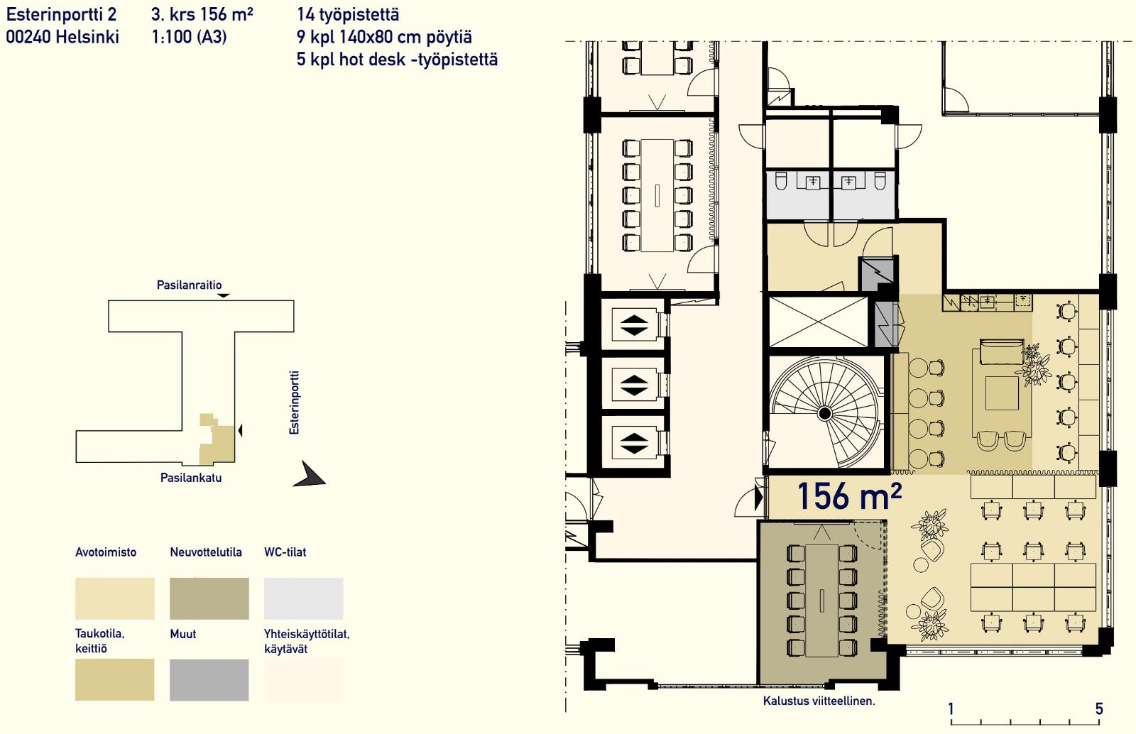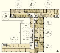 Vuokrataan Helsingin Länsi-Pasilasta kolmannen kerroksen 156 m² kalustamaton pientoimistotila. Tilatunnus B1. pohjakuvassa. Pientoimistojen yhteydessä on kolme yhteiskäyttöistä neuvotteluhuonetta ja niitä palvelevat keittiö sekä WC-tilat.