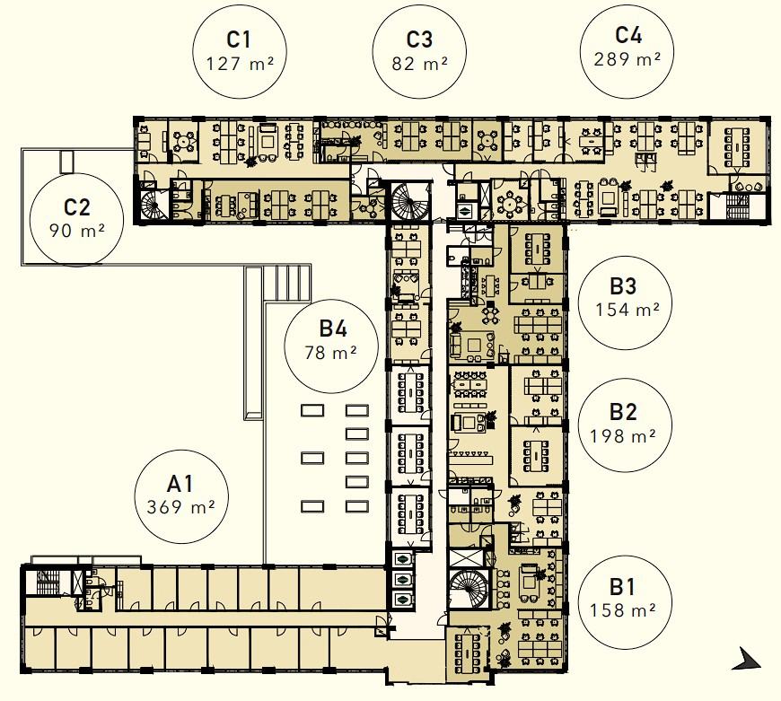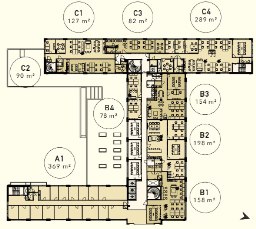 Vuokrataan Helsingin Länsi-Pasilasta kolmannen kerroksen 289 m² kalustamaton pientoimistotila. Tilatunnus C4. pohjakuvassa. Pientoimistojen yhteydessä on kolme yhteiskäyttöistä neuvotteluhuonetta ja niitä palvelevat keittiö sekä WC-tilat.