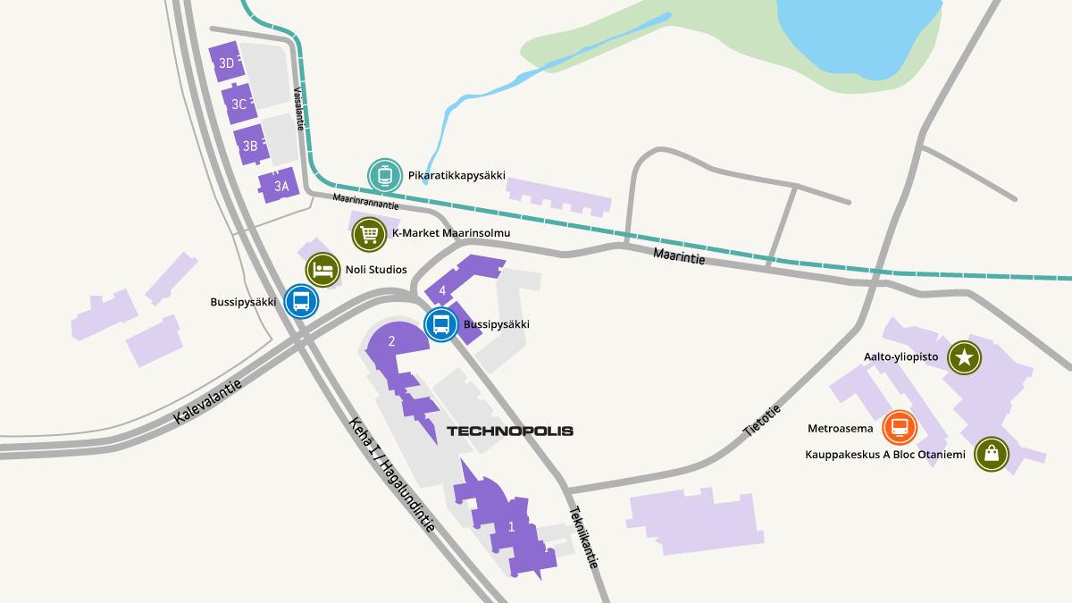 Kampuksen sijainti Kehä I:n varrella on erinomainen — Helppo saavutettavuus metrolla, bussilla, pikaratikalla ja autolla. Kampus sijaitsee myös lähellä Aalto- yliopistoa ja teknologiaosaamisen keskittymää – tämä on ihanteellinen paikka yhteistyölle ja verkostoitumiselle!
