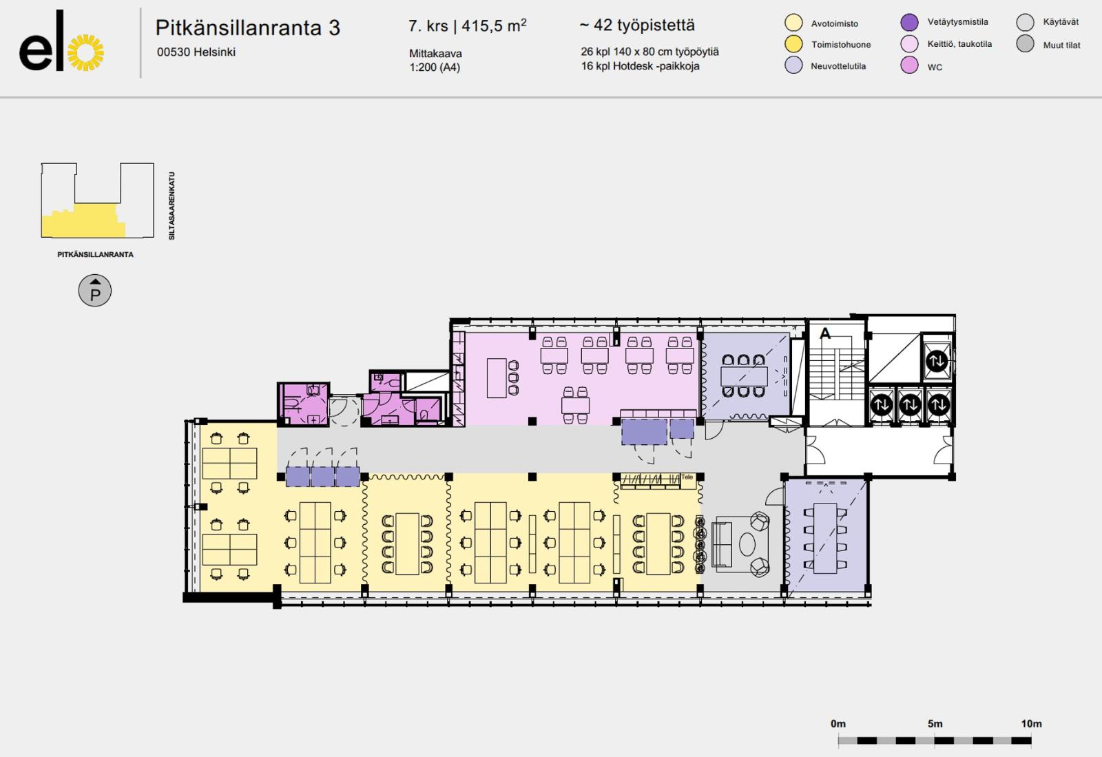 Tila on pääosin avotoimistoa, missä useita vetäytymistiloja sekä kaksi erillistä neuvottelutilaa. Ruokailutilassa on keittiö ja tilojen Ilmanvaihto on jäähdytetty.