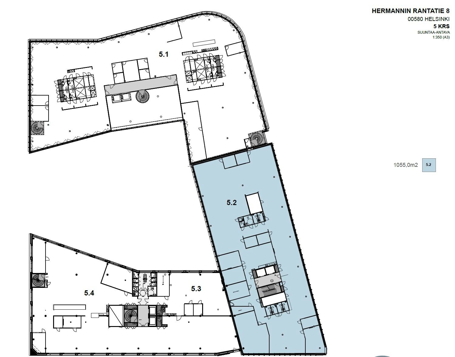 Vuokrataan viidennen kerroksen edustava ja moderni 1055 m² toimistotila Kalasatamasta, Rantatie Business Parkista! Tilassa avotila on jaettu osittain omiksi työalueiksi isommille ja pienemmille tiimeille, lisäksi tilasta löytyy neuvottelu- ja teamstiloja. Suuri keittiö ja loungealue. Tila voidaan laajentaa olemaan 1263 m².
