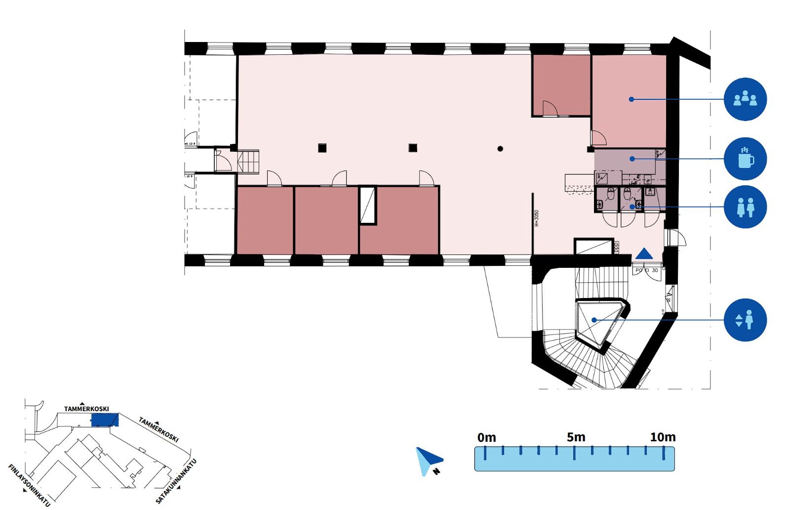 Keskeisen sijaintinsa ansiosta kiinteistöön on helppo saapua ja kaikki keskustan palvelut ovat lähettyvillä. Ratikka ja bussit kulkevat aivan kiinteistön läheisyydessä, ja Tampereen rautatieasemalle on vain lyhyt kävelymatka.