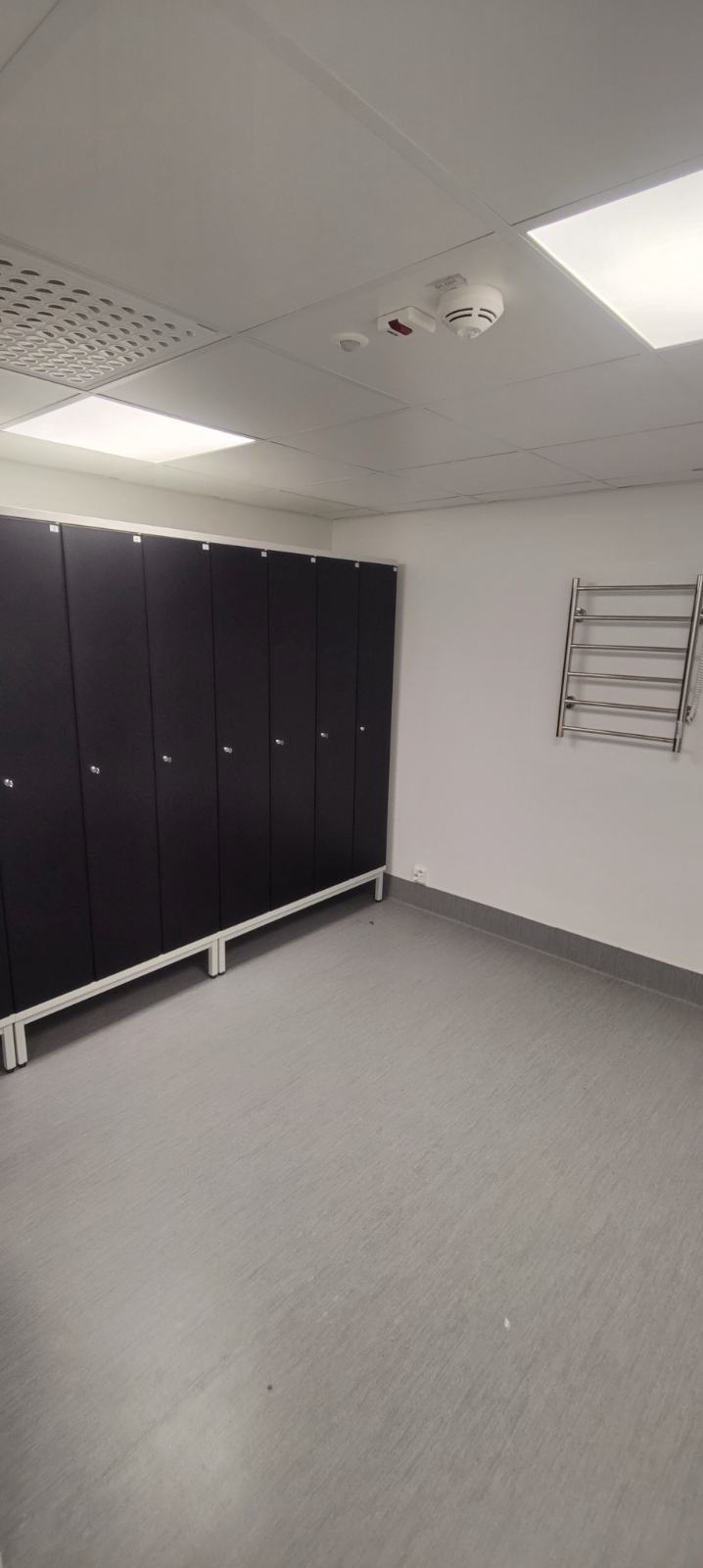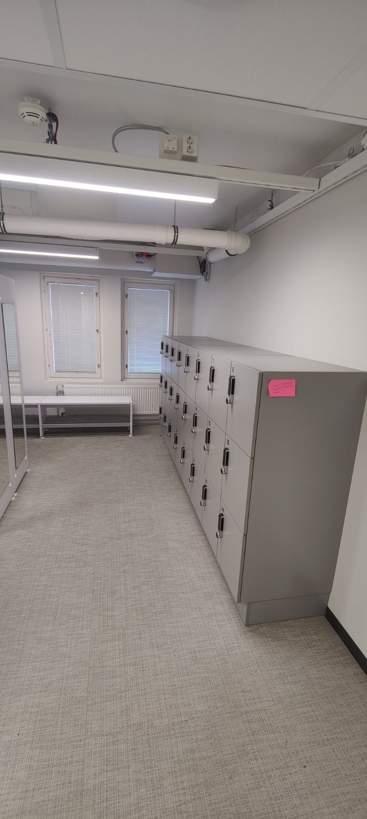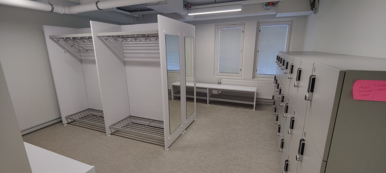 Miehille ja naisille omat pukuhuoneet suihkuilla, sekä lukittavat vaatesäilytyskaapit.