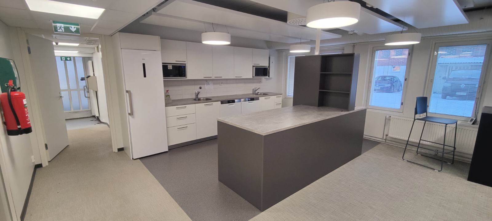 Tilava keittiö ja ruokailualue soveltuvat hyvin henkilöstön yhteiseen käyttöön. Keittiö on runsaasti varusteltu erilaisilla kodinkoneilla.