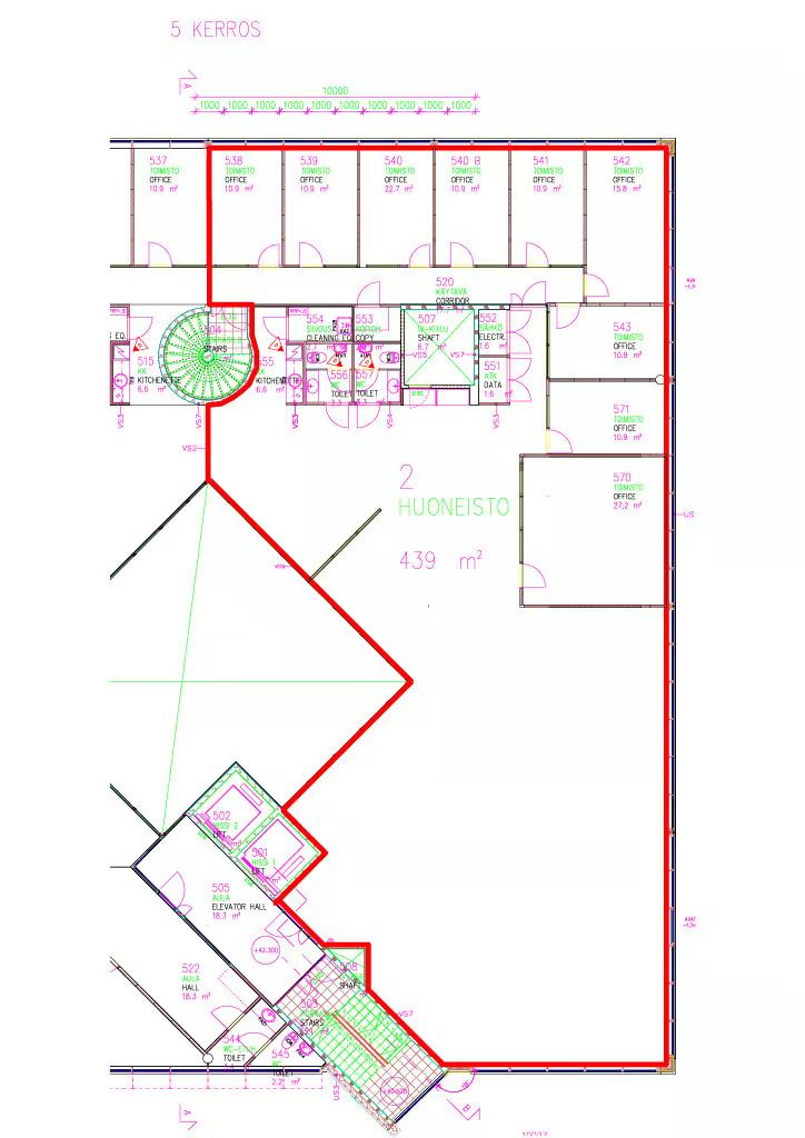 Tilaa on yhteensä 439m2, mikä mahdollistaa joustavat ratkaisut esimerkiksi tiimityötiloille, erillisille työhuoneille, neuvottelutiloille tai avoimelle toimistolle. Rakennuksessa on hissi, mikä tekee liikkumisesta vaivatonta henkilökunnalle ja vieraille.