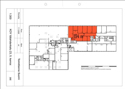 Vuokrattavana viidennen kerroksen 194 m² toimistotila. Tilassa on kuusi ikkunallista huonetta ja kaksi varastohuonetta. Keittiö ja wc ovat yhteisessä käytössä toisen vuokralaisen kanssa.