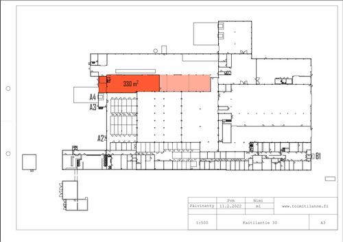 Vuokrataan Orimattilasta katutason 330 m² tuotanto- tai varastotila. Varastohallin korkeus on 7 m. Lastauslaiturin ovikorkeus 2,45 m. Sisäänajomahdollisuus. Oven edustalla on yksi lattiakaivo. Halliin on helppo liittää tarvittava määrä lisätilaa n. 500 m² asti, merkitty pohjakuvaan vaaleammalla värillä.